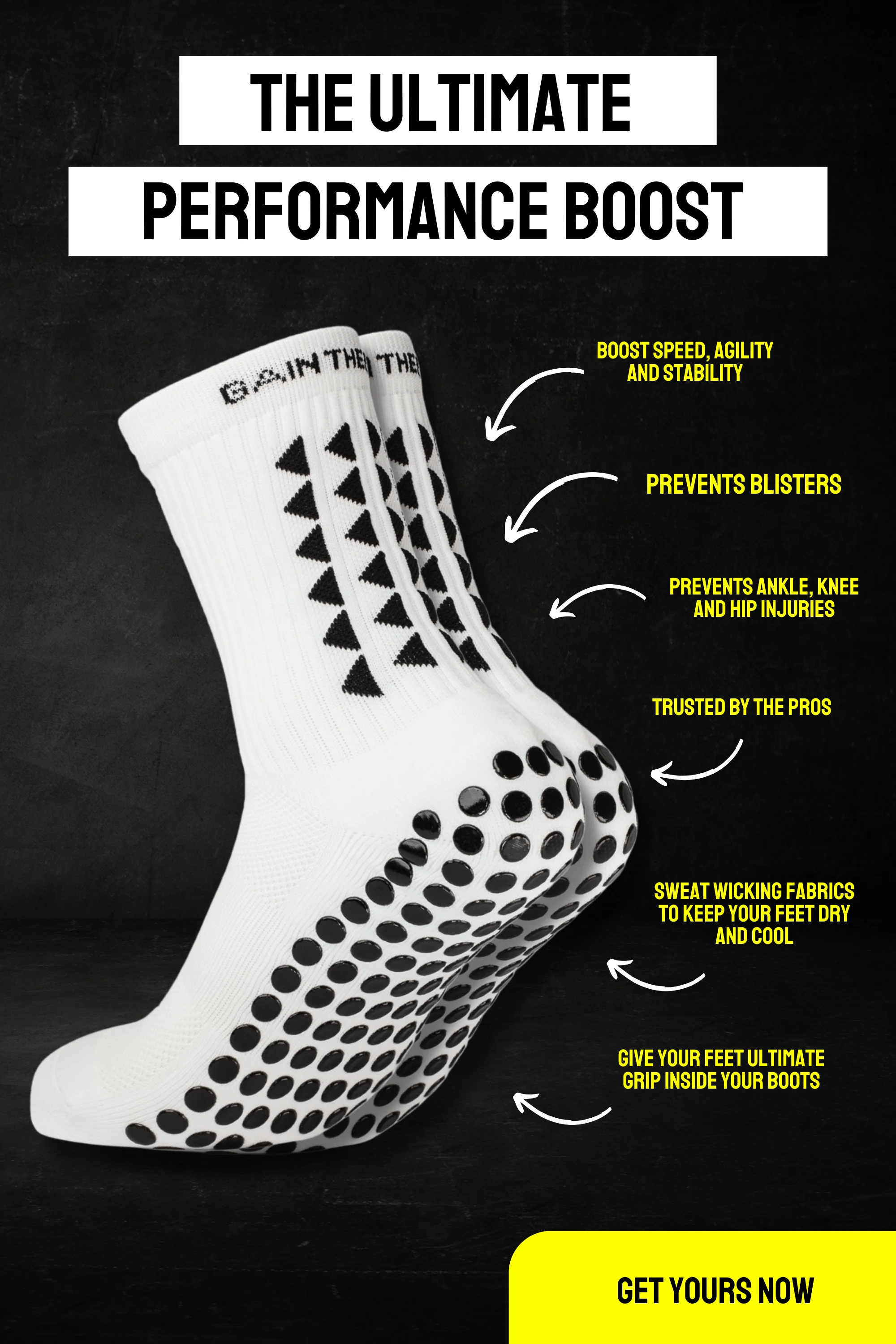 Leave your opponents in the dust! Our Grip Socks are designed to enhance your speed, sharpen your agility, and keep you balanced, so you can perform at your peak every time you hit the pitch.